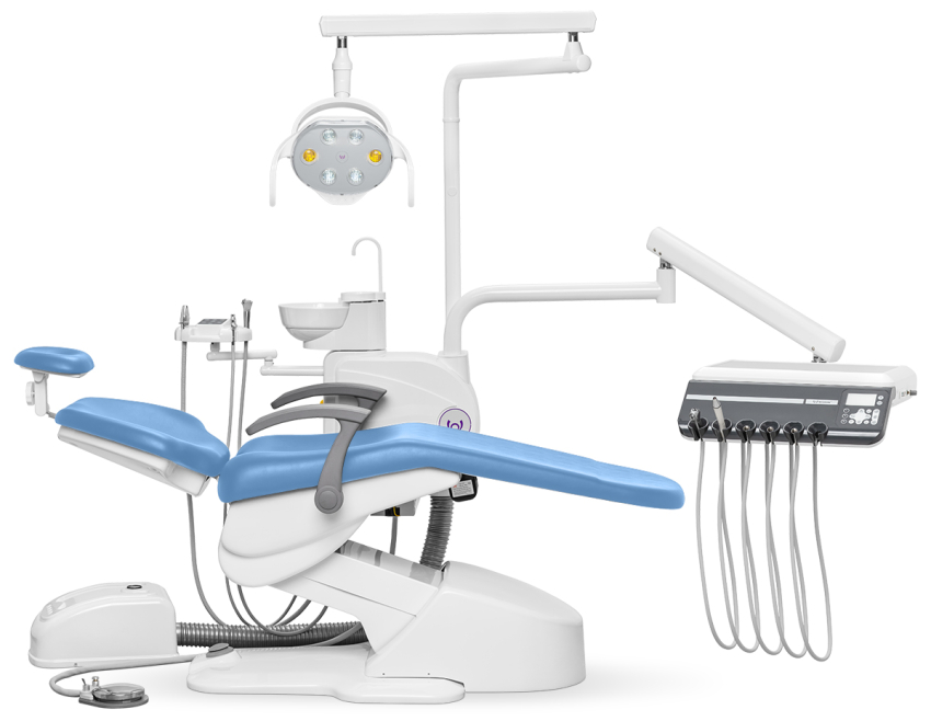 Многие стоматологи выбирают именно нижнюю подачу потому, что так пациент не видит инструментов и не испытывает напряжения. Кроме того, модуль располагается довольно низко и за инструментами не нужно далеко тянуться. Модуль врача рассчитан на 6 инструментов, он имеет пульт управления креслом.
